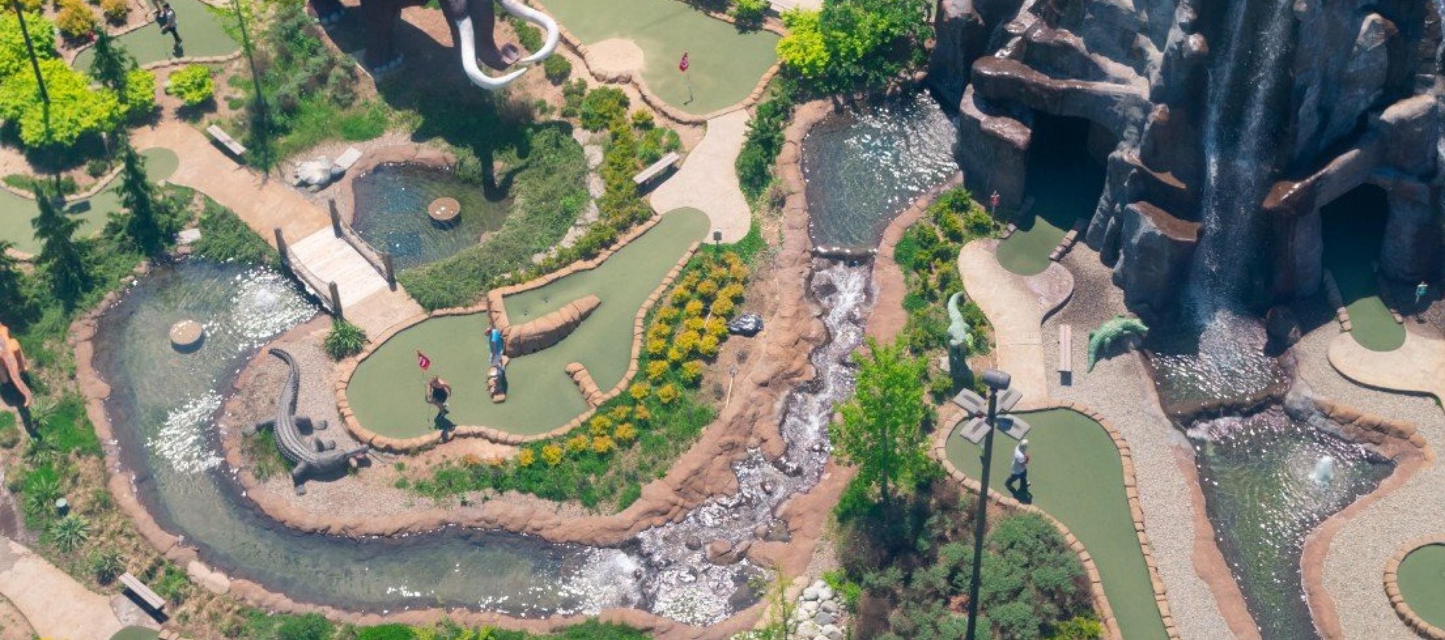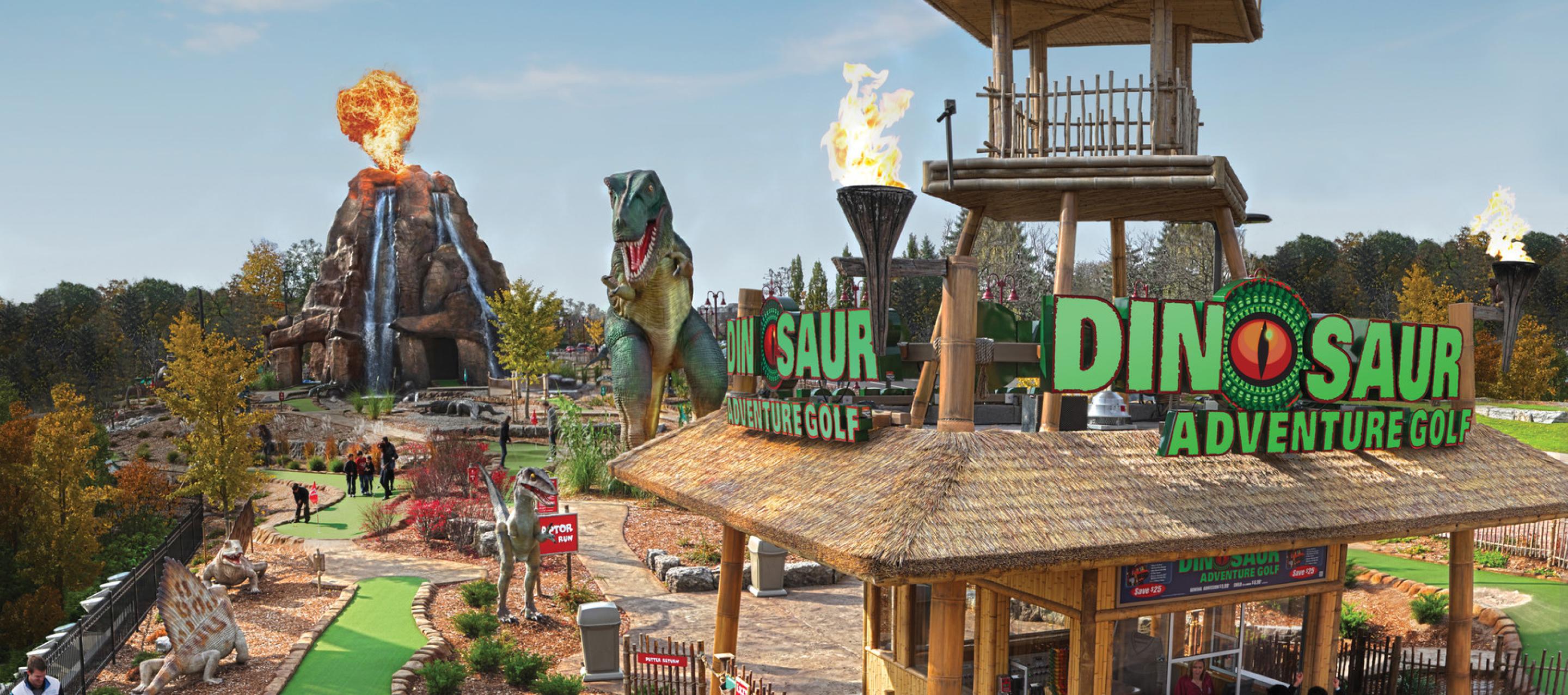 As one of the nation's largest miniature golf courses, Dinosaur Adventure Golf features two 18-hole courses: 'Raptor' and 'T-Rex', 3 distinct decorative ponds with fast-moving rapids and bubblers and a 50 foot high "active" steam-erupting volcano that lets golfers play directly through a realistically eerie, cavernous volcanic interior.