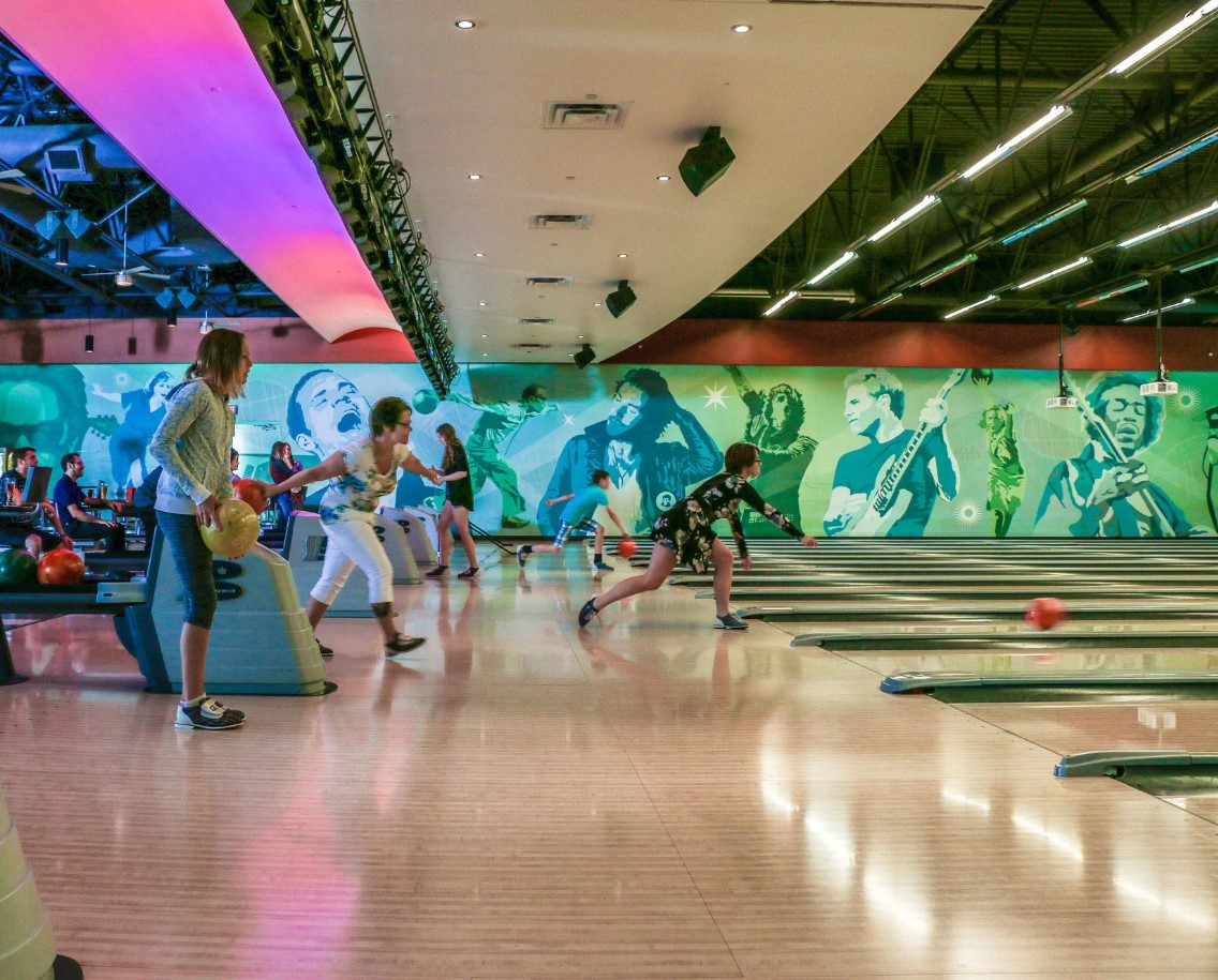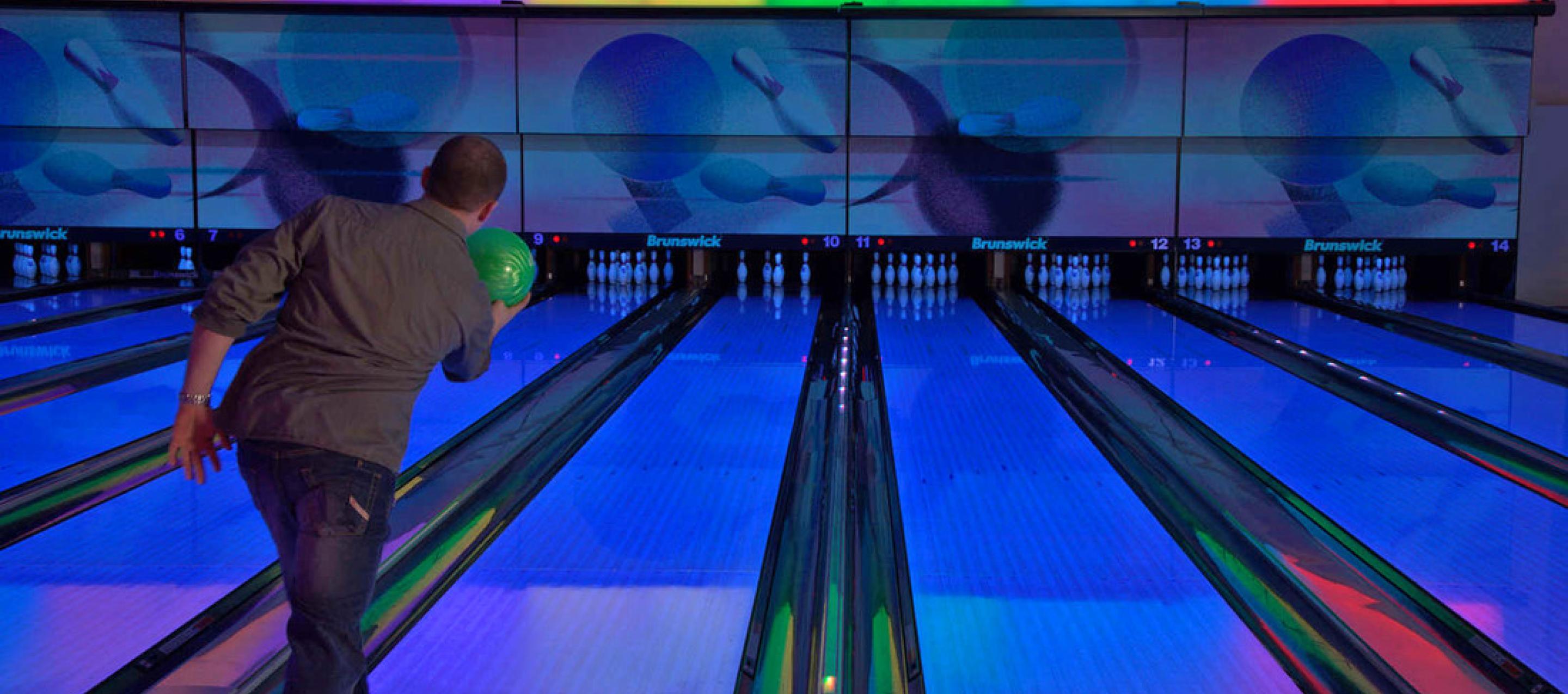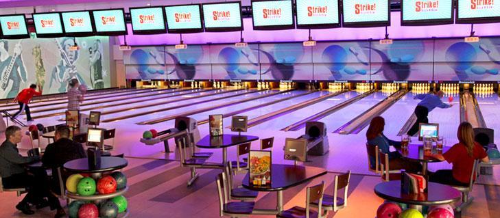 Here you'll find 14 full size 10 pin bowling lanes, a high-def audio/visual system, intelligent LED lane lighting and touch screen monitors for easy, automated scoring. Plus, with special bumper-rails that can be raised or lowered for each player, kids and novice bowlers don't have to throw gutter balls.